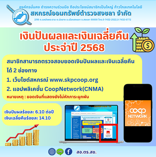 ประกาศ เรื่อง การจ่ายเงินเฉลี่ยคืนประจำปี 2568 (อ่าน:909) |