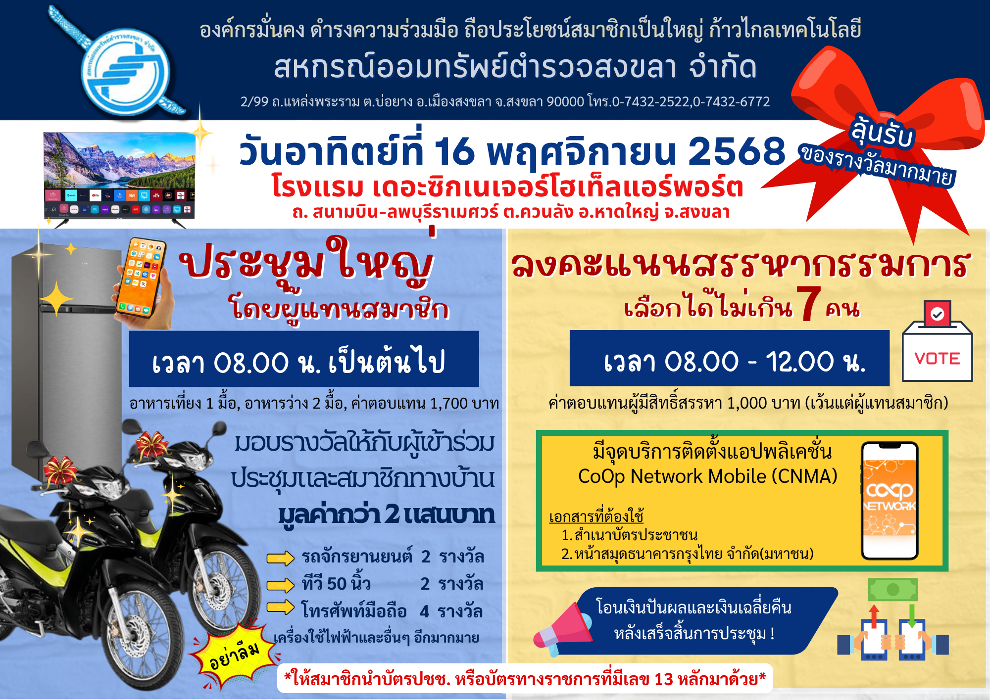 ประกาศ เรื่อง ขอเชิญประชุมใหญ่สามัญประจำปี วันอาทิตย์ 16 พ.ย. 68 ณ โรงแรมเดอะซิกเนเจอร์โฮเทลแอร์พอร์ต อ.หาดใหญ่ จ.สงขลา